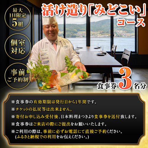 - 活け造り「みどこい」コース食事券(3名分) 食事券 活け造り 個室 天然魚 料理 日本料理 漁師の店 コース料理 魚介類 チケット 海鮮 海の幸 ディナー ランチ お食事券 予約制 【日本料理まつき】akn022-06