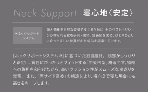 首を優しく支え肩への負担を軽減する両サイド高めのネックサポート形状に、よりハイスペックな素材と構造を採用。高質なクッション性と高度なカッティングによるサスペンション構造を実現しました。