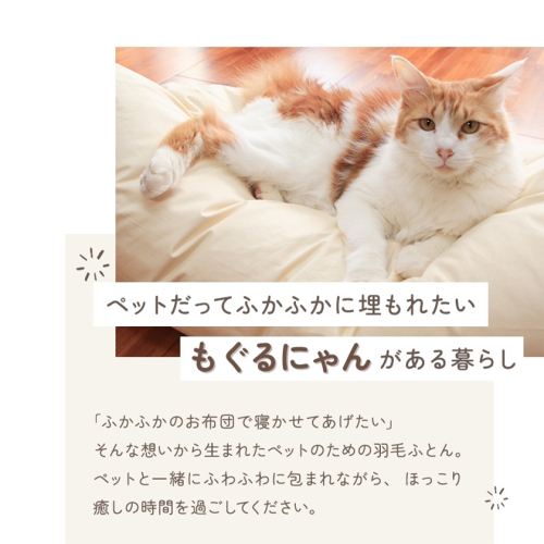 そんな思いから生まれた“ペットのための羽毛ふとん”は、貴重なホワイトダックダウンを85%使用しており、「ニューゴールドラベル」を取得した高品質な羽毛布団です。都城市の工場で熟練の職人が原毛の洗浄から縫製に至るまで丁寧に仕上げています。