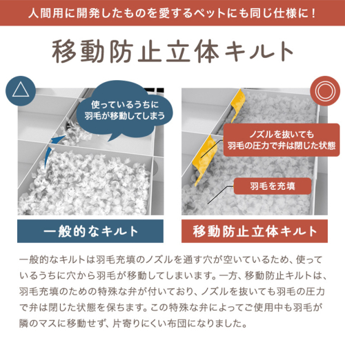 「移動防止立体キルト」とは、羽毛充填の特殊な弁が羽毛の圧力により塞いだ状態を保つため、使っているうちに羽毛が隣のマスに移動せず、片寄りにくい布団を実現できる自社開発のキルトです。