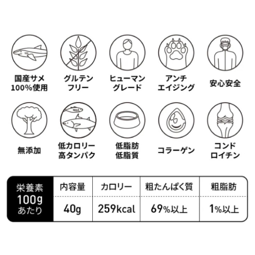コラーゲンやコンドロイチン、カルシウムをたっぷり含んでおり、ワンちゃんの日々の健康やアンチエイジングが気になる飼い主様におすすめの、安心・安全に与えていただけるおやつです。