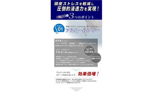 頭皮のストレスを軽減した馬油を成分とした薬用育毛剤です。育毛剤は、爽快感等の使用感がわかりやすい製品が多くございますが、これはアルコールが配合されているからです。頭皮にとってアルコールはたんぱく質を破壊や、頭皮を乾燥させてしまうことがあります。私たちの『ウーマフリード』はアルコールをはじめとする、防腐剤、殺菌剤、石油系活性剤、合成色素、紫外線吸収剤、鉱物油、香料の8つの頭皮に刺激を与えるといわれている成分がない、オールフリー育毛剤を作りました。頭皮のストレスになる成分をなくすことで、頭皮ストレスを軽減し、成分を吸収しやすくなります。