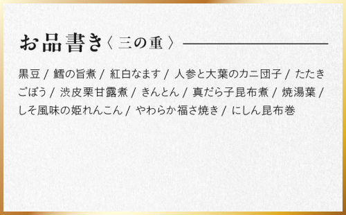 黒豆、鱈の旨煮、紅白なます、人参と大葉のカニ団子、たたきごぼう、渋皮栗甘露煮、きんとん、真だら子昆布煮、焼湯葉、しそ風味の姫れんこん、やわらか福さ焼き、にしん昆布巻 以上12品