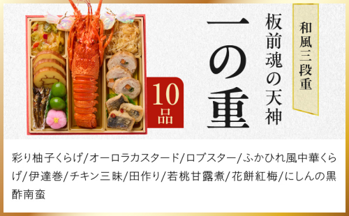 彩り柚子くらげ、オーロラカスタード、ロブスター、ふかひれ風中華くらげ、伊達巻、チキン三昧、田作り、若桃甘露煮、花餅紅梅、にしんの黒酢南蛮 以上10品