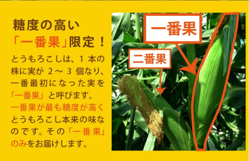 とうもろこしは1本の株に実が2~3個なり、一番最初になった実を「一番果」と呼びます。一番果が最も糖度が高くとうもろこし本来の味なのです。