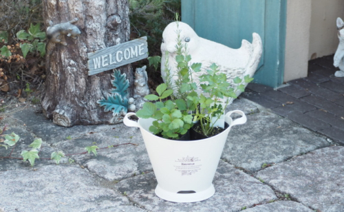 おしゃれな形の鉢。プラステック製で軽くて持ち運びも楽。おしゃれで人気のハーブを植込みました。ハーブは摘み取ってお料理などにご利用頂けます。